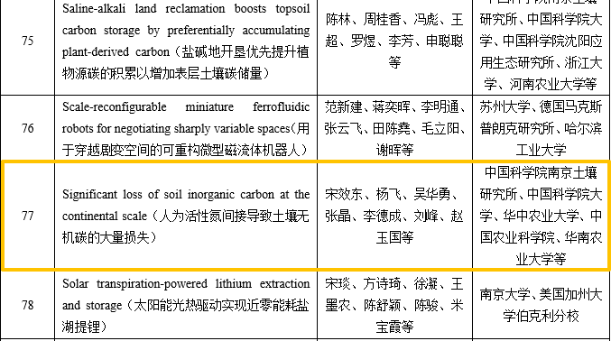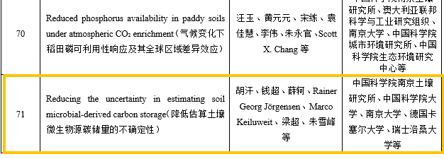 在此次评选中,江苏省土壤学会推荐的2篇论文入选,分别为《Reducing the uncertainty in estimating soil microbial-derived carbon storage》(作者:胡汗、钱超、薛轲、Rainer Georg Jörgensen、Marco Keiluweit、梁超、朱雪峰等;单位:中国科学院南京土壤研究所、中国科学院大学、南京大学、德国卡塞尔大学、瑞士洛桑大学等)和《Significant loss of soil inorganic carbon at the continental scale》(作者:宋效东、杨飞、吴华勇、张晶、李德成、刘峰、赵玉国等;单位:中国科学院南京土壤研究所、中国科学院大学、华中农业大学、中国农业科学院、华南农业大学等)。