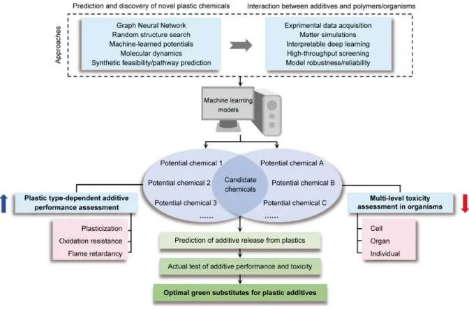 2. 构建覆盖细胞、器官和个体水平的多层级毒性预测模型,涉及化学品与环境介质的相互作用以及代谢中间体,进而高通量筛选低毒或无毒塑料化学品。利用机器学习预测候选化学品的合成可行性与合成途径,评估合成成本。最后,通过实验验证目标化学品的实际性能与毒性,持续收集新型聚合物与添加剂的相互作用数据,不断优化化学生成与评估模型。