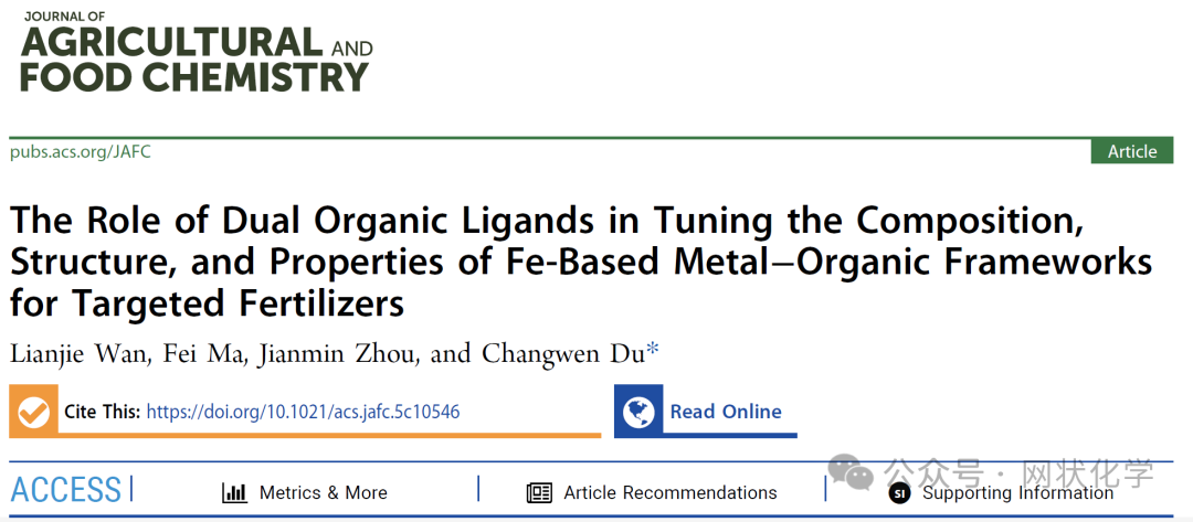 近日,中国科学院南京土壤研究所杜昌文研究员团队在农业化学领域顶级期刊《Journal of Agricultural and Food Chemistry》发表最新研究成果。该研究通过引入双有机配体(草酸和酒石酸),成功合成了一种新型铁基金属-有机框架(Fe-MOFs)材料。研究发现,双配体之间的竞争配位作用改变了材料的微观结构和养分释放动力学,使其不仅能作为高效的缓释肥料(CRF),还能显著改善盐碱土壤理化性质,大幅提高作物产量。